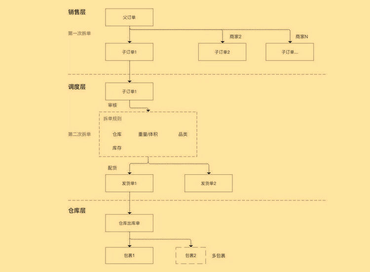 經(jīng)過(guò)以上原則進(jìn)行拆單后,一個(gè)子訂單可能拆成多個(gè)發(fā)貨單,也可能一個(gè)子訂單還是對(duì)應(yīng)一個(gè)發(fā)貨單,最好的狀態(tài)是一個(gè)子訂單對(duì)應(yīng)一個(gè)發(fā)貨單,發(fā)貨單下發(fā)至倉(cāng)庫(kù),倉(cāng)庫(kù)就可以打包成一個(gè)包裹進(jìn)行出庫(kù)。