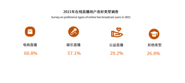 觀看直播的用戶有60.8%喜歡看電商直播,其次是娛樂直播,有超五成的用戶喜歡。自2020年初疫情開始,線下活動受制,多地都開始使用直播形式幫助經(jīng)濟產(chǎn)業(yè)恢復,使得公益直播以及助農(nóng)直播等也逐漸被網(wǎng)民所關注。