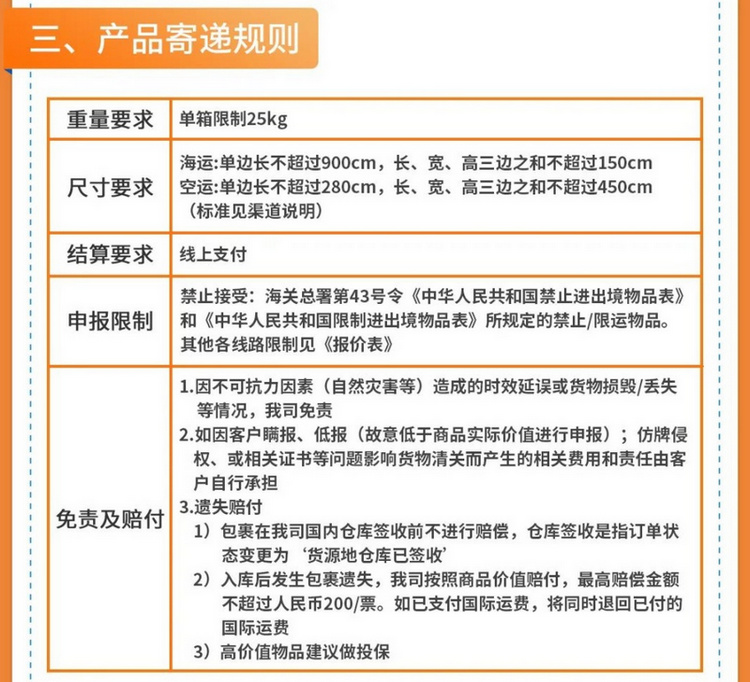 具體寄遞規(guī)則方面,重量要求,單箱限制25kg。尺寸要求:海運(yùn),單邊長(zhǎng)不超過900cm,長(zhǎng)、寬、高三邊之和不超過150cm;空運(yùn),單邊長(zhǎng)不超過280cm,長(zhǎng)、寬、高三邊之和不超過450cm。下附完整寄遞規(guī)則: