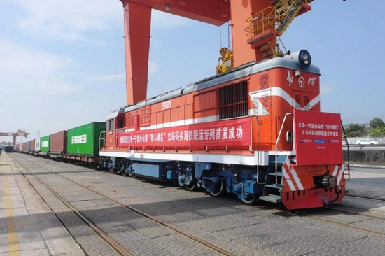 在海鐵聯(lián)運方面,今年7月1日,義烏首趟海鐵聯(lián)運跨境電商專列開行。滿載100個標準箱跨境電商貨物的81942次“以星號”海鐵聯(lián)運專列從義烏西站鳴笛啟程,駛往寧波舟山港。