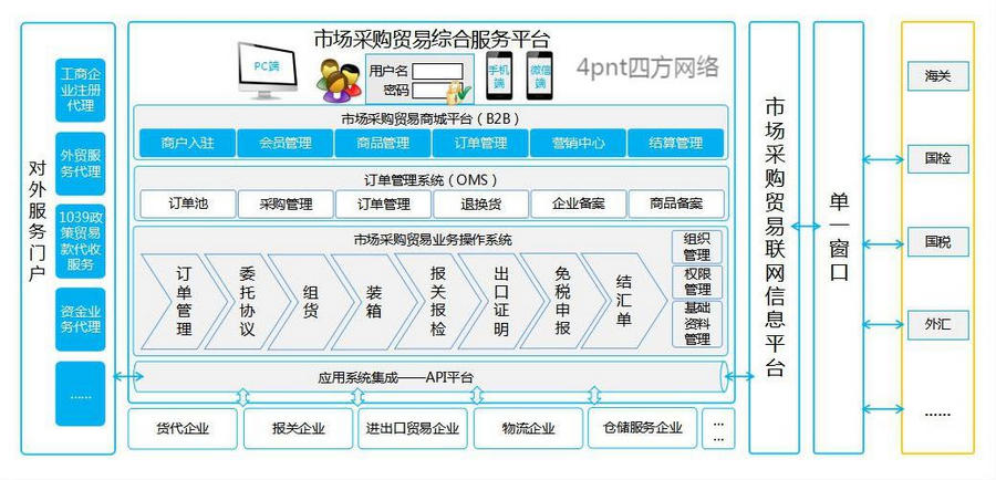 為了暢通市場采購貿(mào)易,改變原來那些不交稅的企業(yè)無票出口的問題,把不合規(guī)的業(yè)務(wù)陽光化,給商戶解決合規(guī)出口和收結(jié)匯等問題。4PNT四方網(wǎng)絡(luò)市場采購貿(mào)易平臺解決方案利用互聯(lián)網(wǎng)技術(shù)、現(xiàn)代化物流技術(shù)及互聯(lián)網(wǎng)金融技術(shù),構(gòu)建互聯(lián)網(wǎng)+外貿(mào)的市場采購貿(mào)易平臺,構(gòu)建智能化、協(xié)同化的跨境外貿(mào)、O2O交易、供應(yīng)鏈、外貿(mào)通關(guān)及金融一體化服務(wù)平臺。