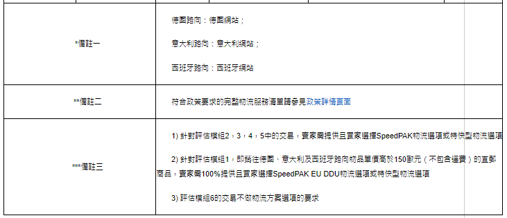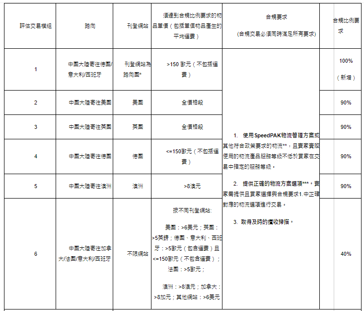 因此,eBay在原有物流要求基礎(chǔ)之上更新了 SpeedPAK物流管理政策,針對(duì)賣家銷往德國(guó)、意大利及西班牙路向物品單價(jià)高於150歐元(不包含運(yùn)費(fèi))的直郵商品,政策將要求賣家100%提供SpeedPAK EU DDU物流選項(xiàng)或特快型物流選項(xiàng),並實(shí)際使用與物流選項(xiàng)匹配的SpeedPAK標(biāo)準(zhǔn)型服務(wù)或者符合政策要求的特快型物流服務(wù)(詳情請(qǐng)見(jiàn)政策頁(yè)面)。相關(guān)調(diào)整將於2021年9月12日(交易日)正式生效,最新考核要求如下: