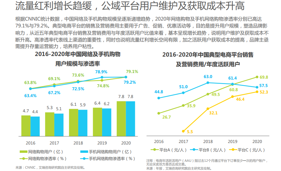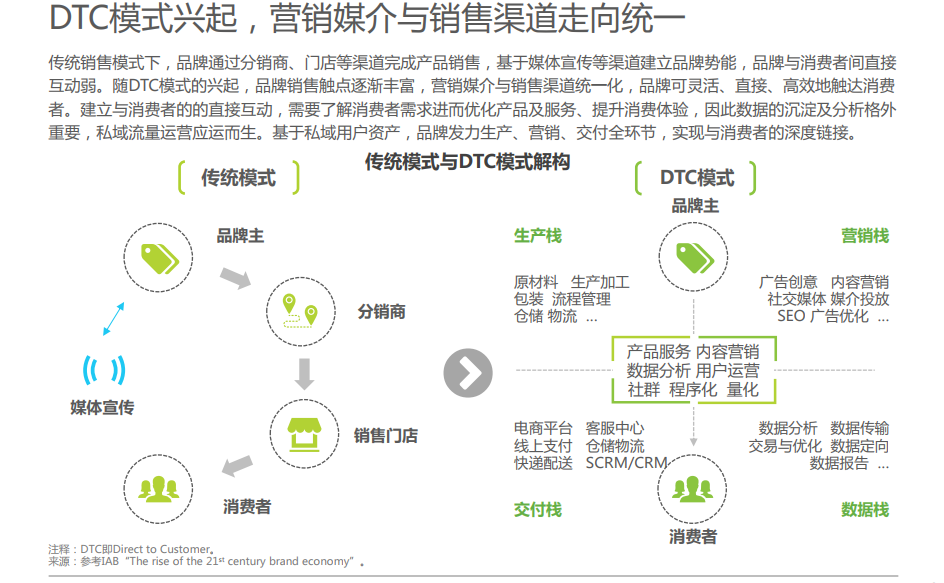 首先了解一下發(fā)展背景:私域流量可被定義為沉淀在品牌或者個人渠道的,可隨時及反復(fù)觸達的,能實現(xiàn)一對一精準(zhǔn)運營的用戶流量。網(wǎng)絡(luò)購物的高滲透率及公域平臺獲客成本的升高催化存量運營能力;DTC模式的興起對消費者洞察提出更高要求;新冠疫情從供求兩端推動數(shù)字化轉(zhuǎn)型,私域流量營銷應(yīng)運而生。