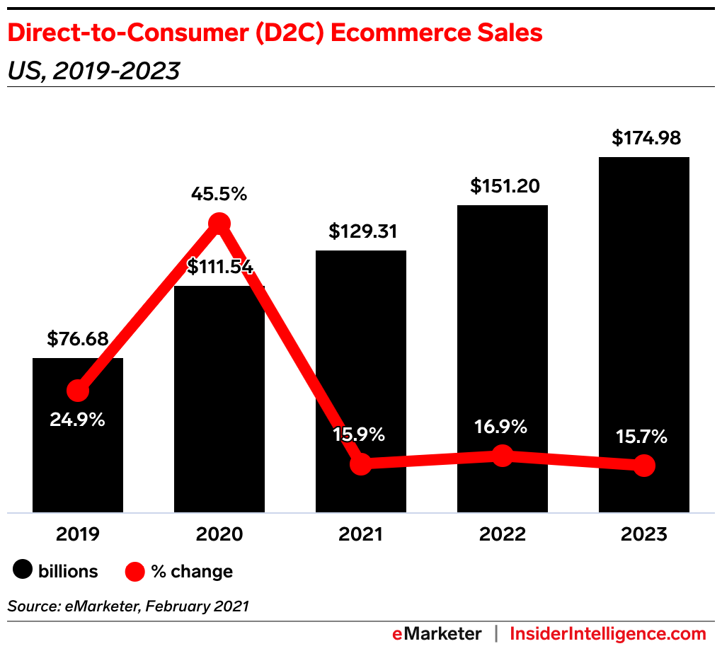 eMarketer預(yù)測,美國DTC電商銷售額在2022年將達(dá)到1512億美元,與今年相比增長16.9%。未來一年內(nèi),DTC零售額雖然僅占零售總額的2.5%,但是這些品牌通過多樣化的消費(fèi)者體驗(yàn),將會成功顛覆傳統(tǒng)零售業(yè)。