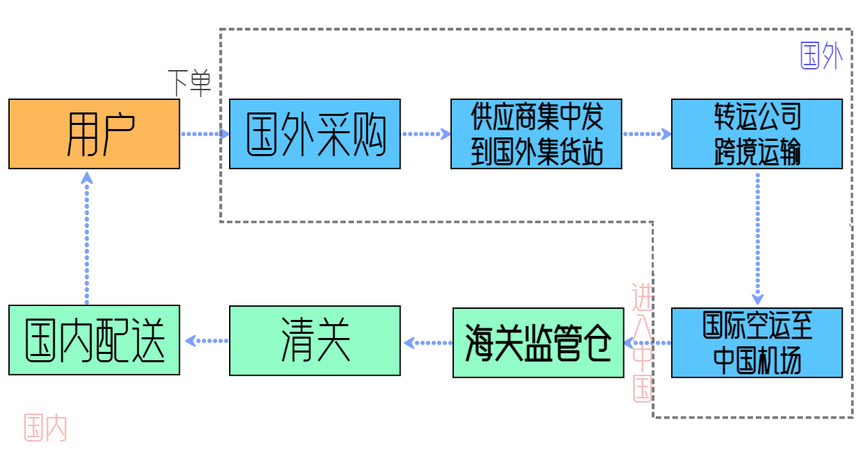 跨境電商直郵進口模式的流程:用戶下單,訂單的相關(guān)信息會推到國外采購系統(tǒng)進行采購,然后訂單會進行分揀,并給包裝貼標,再通過國際商業(yè)快遞或各國郵政系統(tǒng),由國際空運至中國國內(nèi)機場進入中國。進入中國的貨物,還需要進入海關(guān)監(jiān)管倉進行清關(guān)。最后,通關(guān)后的貨物會進行國內(nèi)配送,送到用戶手上。整個流程如下圖