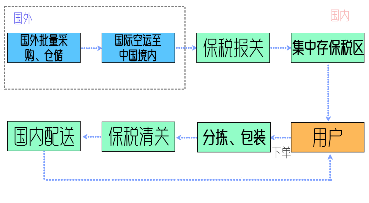 跨境電商保稅進口模式流程:先在國外采購貨物,然后通過國際空海運等方式將貨物運輸進入國內(nèi),接著進行保稅報關(guān),并集中存放在保稅區(qū)。當用戶下單后,訂單信息推送到海關(guān)平臺,傳到貨物存儲處,進行分揀、包裝貼標,最后進行保稅清關(guān),通關(guān)后,進行國內(nèi)配送到用戶手中。整個流程如下圖: