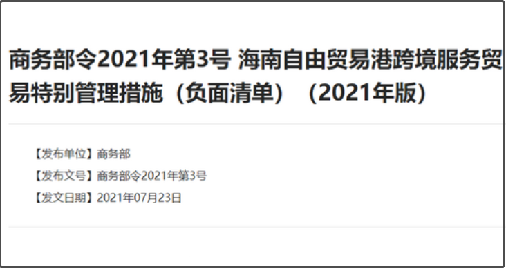 經(jīng)國務(wù)院審定,商務(wù)部發(fā)布《海南自由貿(mào)易港跨境服務(wù)貿(mào)易特別管理措施(負(fù)面清單) (2021年版)》,這是我國在跨境服務(wù)貿(mào)易領(lǐng)域公布的第一張負(fù)面清單!再次彰顯我國開放的力度和深度!負(fù)面清單僅包括11類70項(xiàng)特別管理措施,負(fù)面清單外的領(lǐng)域在海南自貿(mào)港內(nèi)按照境...