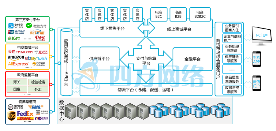 打造7平臺1門戶支撐商貿(mào)市場全方位運營與管理需要,實現(xiàn)商流、物流、資金流、信息流四流合一。